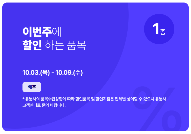 할인 대전에서 주요 할인 품목은 신선하고 질 좋은 국산 농축산물들이에요. 식탁을 더욱 풍성하게 해줄 다양한 품목들이 준비되어 있어요! 10월 03일부터 10월 09일까지 아래의 품목들을 할인된 가격에 구매할 수 있으니, 알뜰 쇼핑을 시작해보세요. 💪