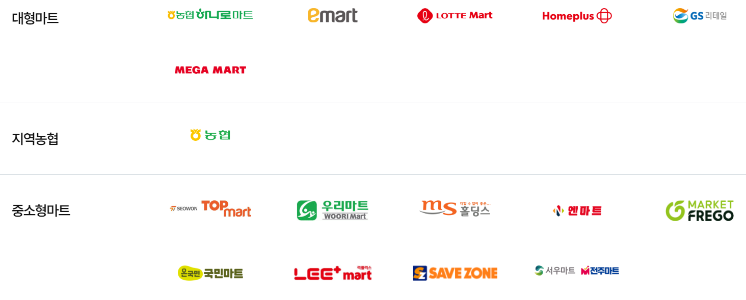 - 다양한 판매 채널: 대형마트부터 전통시장, 친환경 매장, 로컬푸드 직매장, 그리고 온라인 쇼핑몰까지! 어디에서나 할인을 받을 수 있어 접근성이 정말 뛰어나답니다.