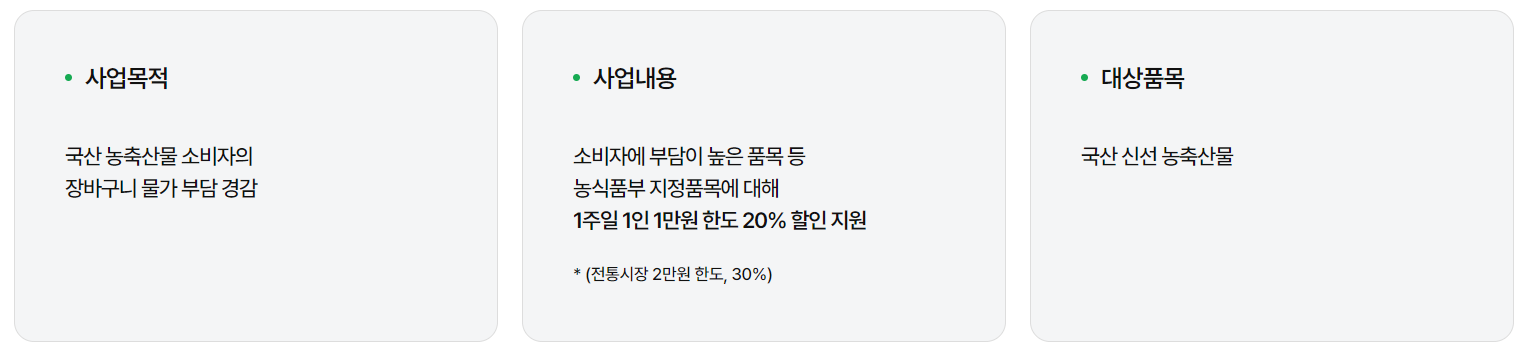 - 전통시장: 전국 각 지역의 전통시장에서 신선한 농산물을 구매할 수 있답니다. 전통시장에서 특히 더 많은 할인 혜택을 받을 수 있어요!